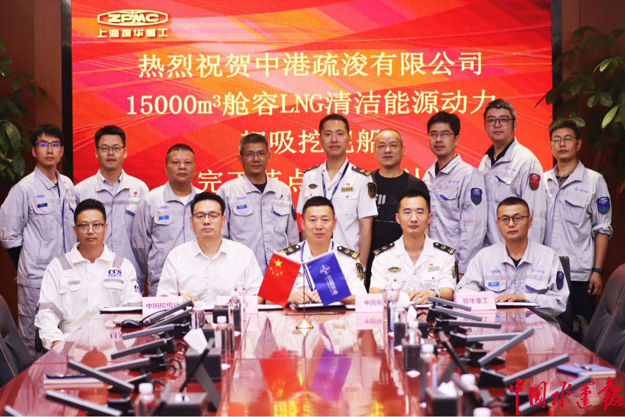 9月10日,由中交上航局出资、上海振华重工承建的15000方舱容等级清洁能源动力耙吸式挖泥船“新海鲟”轮顺畅举办竣工节点四方承认典礼,海事、船检、船东、船厂四方代表人员一起到会,签署了四方见证相关文件。
