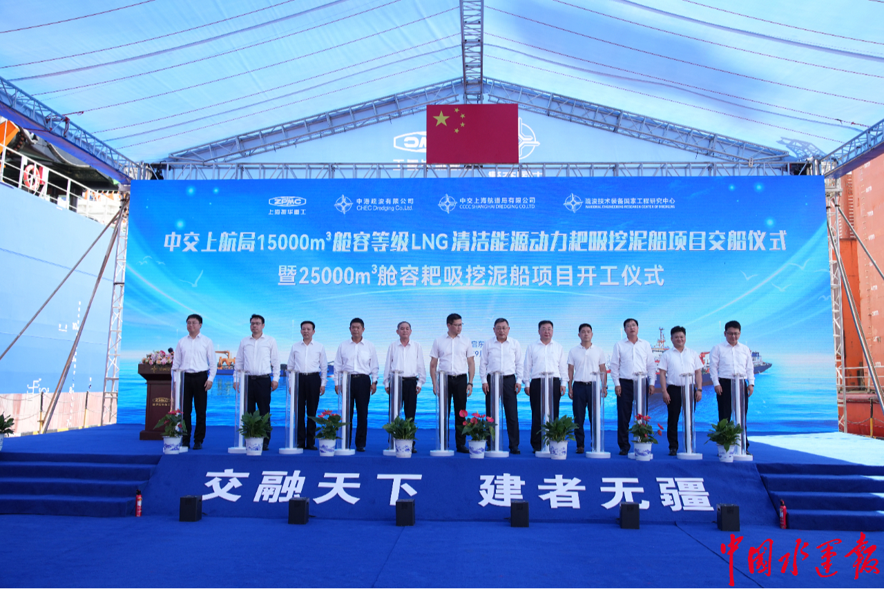 9月19日,两艘“疏浚神器”同日传来喜讯。上午10时38分,上海振华重工为中交上海航道局有限公司制作的15000m³舱容等级LNG清洁能源动力耙吸挖泥船“新海鲟”轮交船典礼暨25000m³舱容耙吸挖泥船项目开工典礼在振华重工启东海工舾装码头举办。